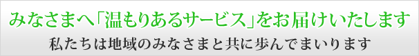 今後も地域に根ざし、みなさま方が安心して利用できる「医療」「介護」「福祉」「保健」を包括的に提供し推進することで地域に密着した事業を行い地域の福祉と医療に貢献していけるよう、職員一同一丸となり一生懸命努め、みなさまへ「温もりあるサービス」をお届けいたします。